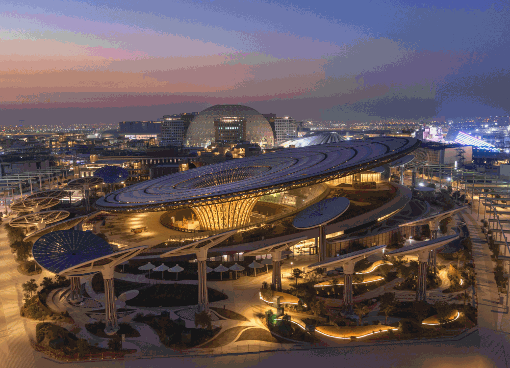 2020年迪拜世博会中国馆的主体修建叫“中原之光”,寓意希望和灼烁。中国馆修建遵照“中西合璧、以中为主、古今融会”的设计原则,将中国元素与现代科技巧妙团结,彰显中华文化自信和大国风范。其竹苞松茂的灯光秀,成为夜晚世博园最耀眼的景物!