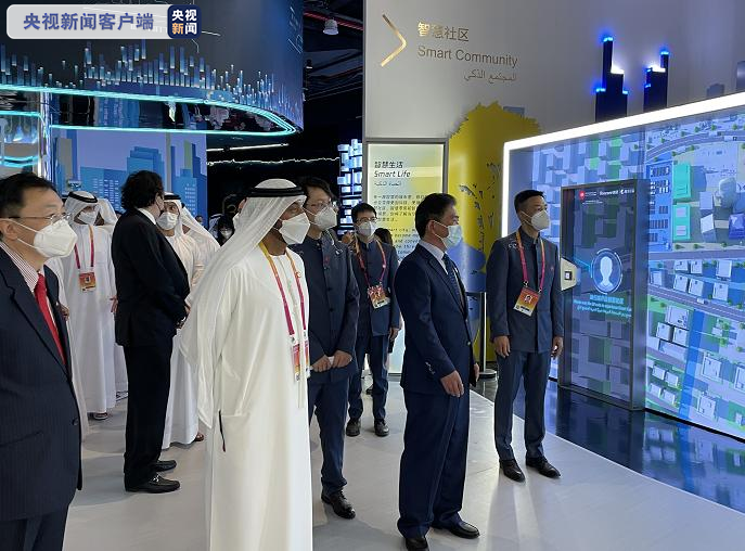 迪拜世博会中国政府总代表、中国贸促会副会长张慎峰(前排右二);中国驻阿联酋大使倪坚(前排左一);迪拜2020年世博会高级委员会主席谢赫·艾哈迈德·本·赛义德·阿勒马克图姆(前排左二)(图片泉源:央视新闻客户端)